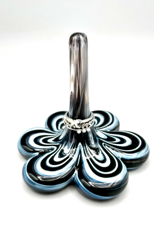 Black White Swirl Glass Ring Stand – Handmade Jewelry Organizer, Modern Ring Holder for Dresser