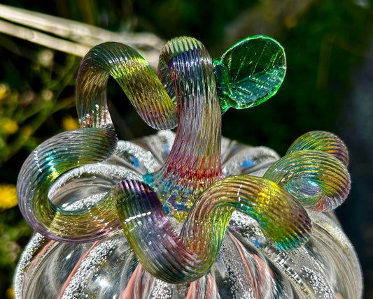 Crystal Rainbow Glass Pumpkin with Leaf Gift and Centerpiece 5 1/2"