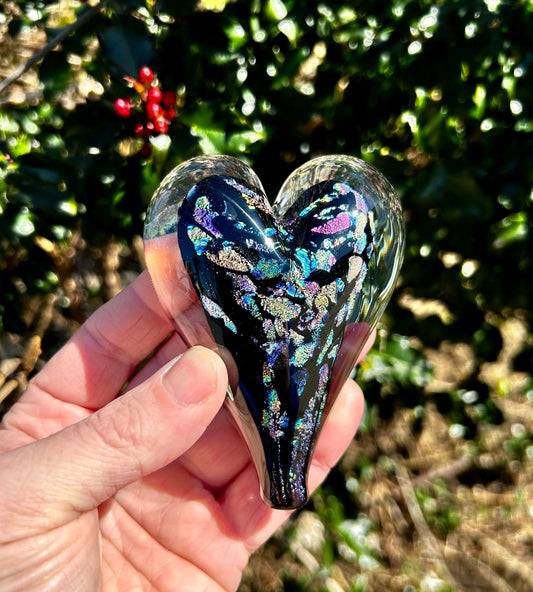 Black Rainbow Dichroic Glass Heart with Black Velvet Gift Pouch 3 3/4"