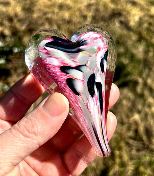 Little Pink Pigeon Glass Heart with Black Velvet Gift Pouch 3 3/4"