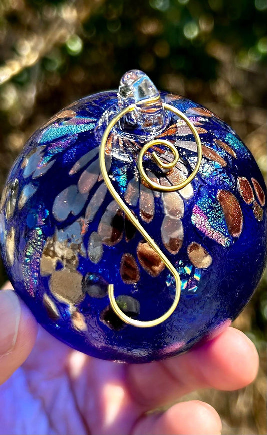 Golden Cobalt Dichroic Glass 3" Ornament comes with a golden shepherd's hook and clear gift box