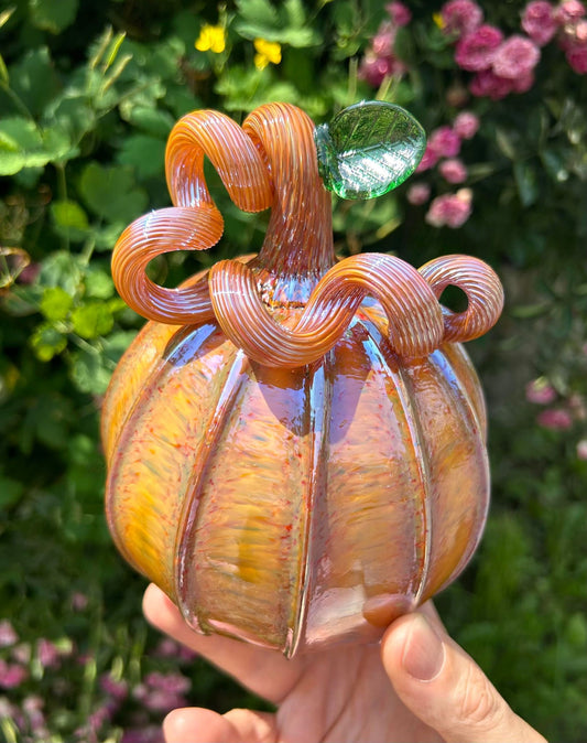 Baby Sea Glass Pumpkin with Sparkly Adventurine Gold and Curly-Q Stem Gift and Centerpiece
