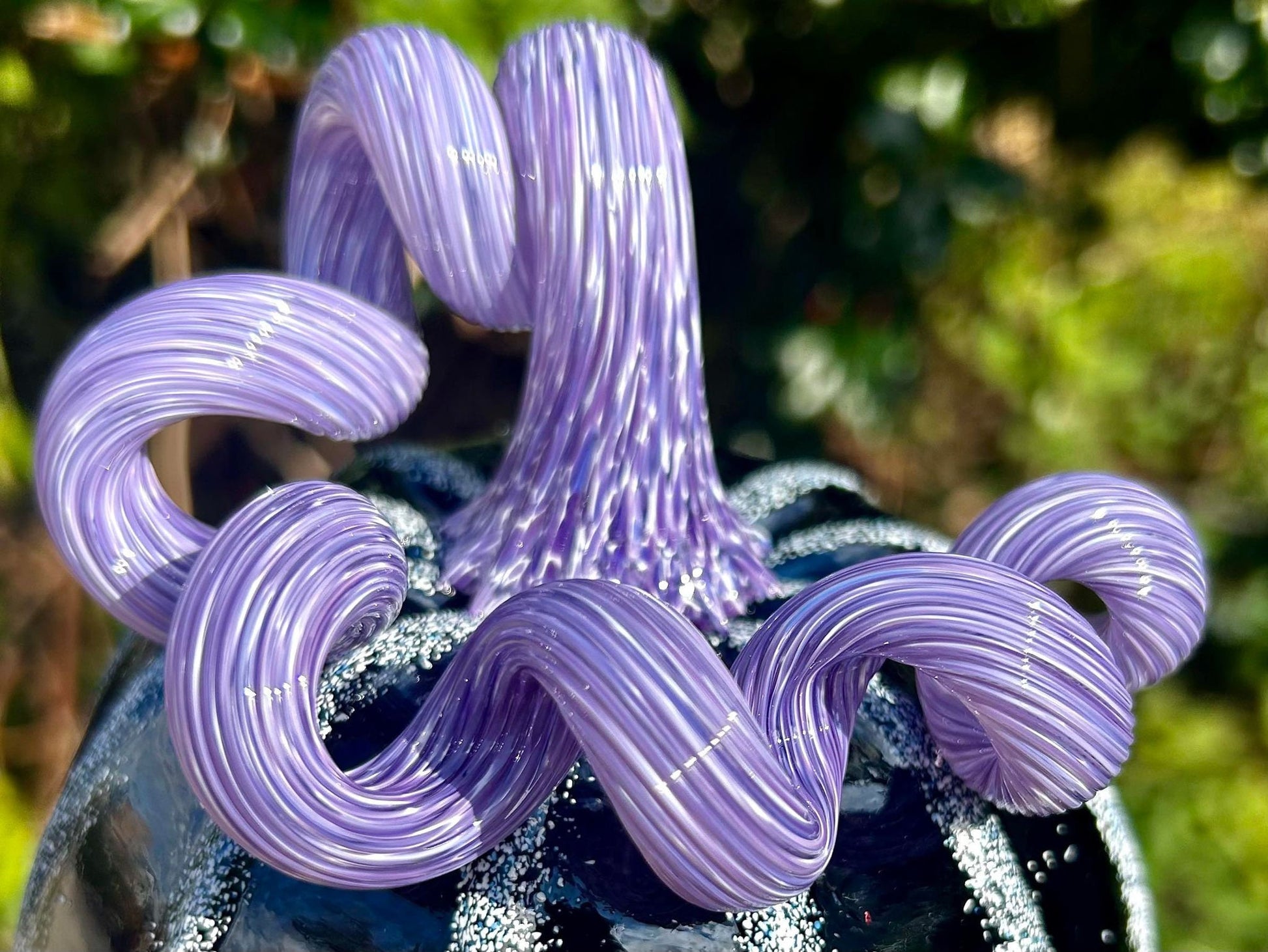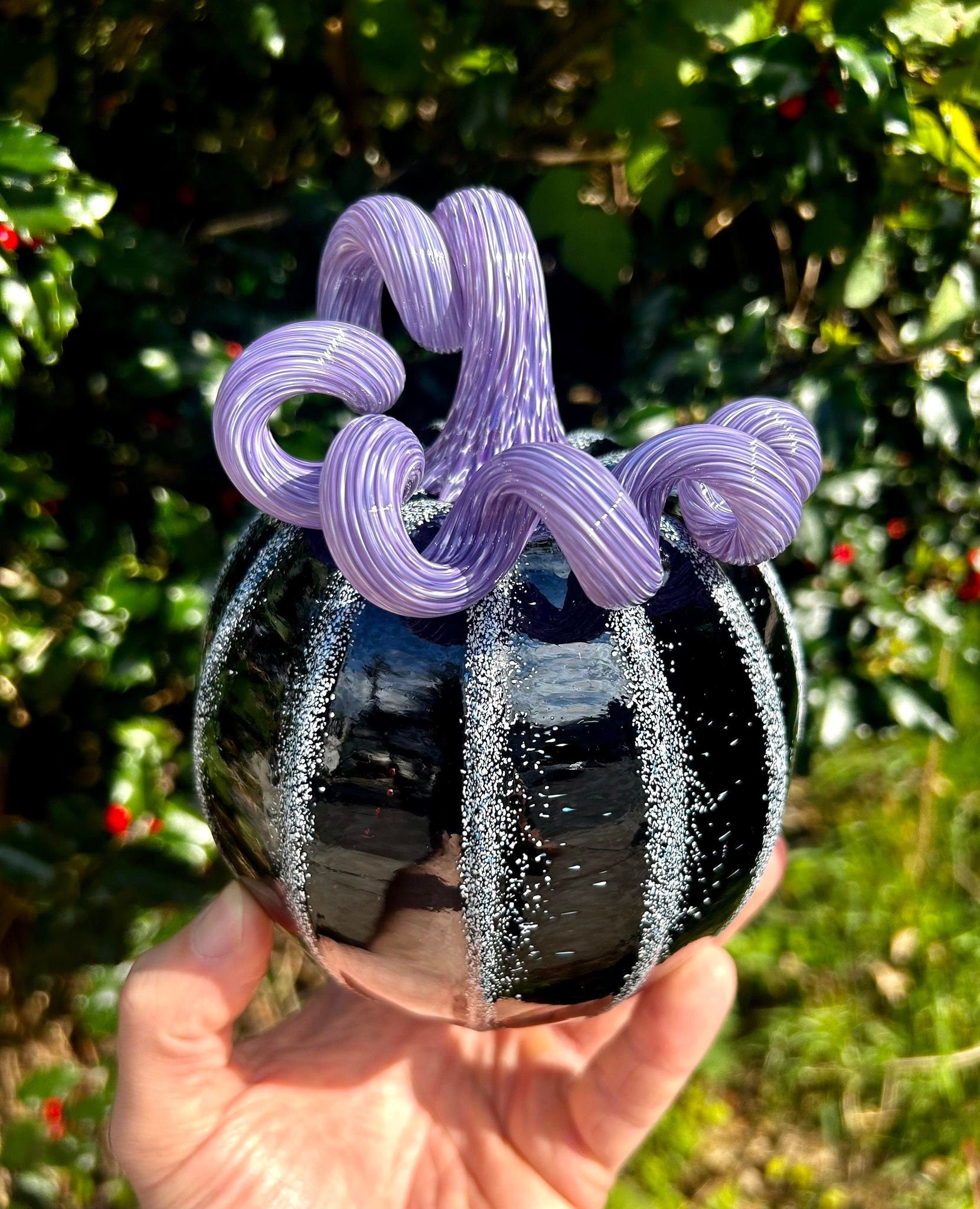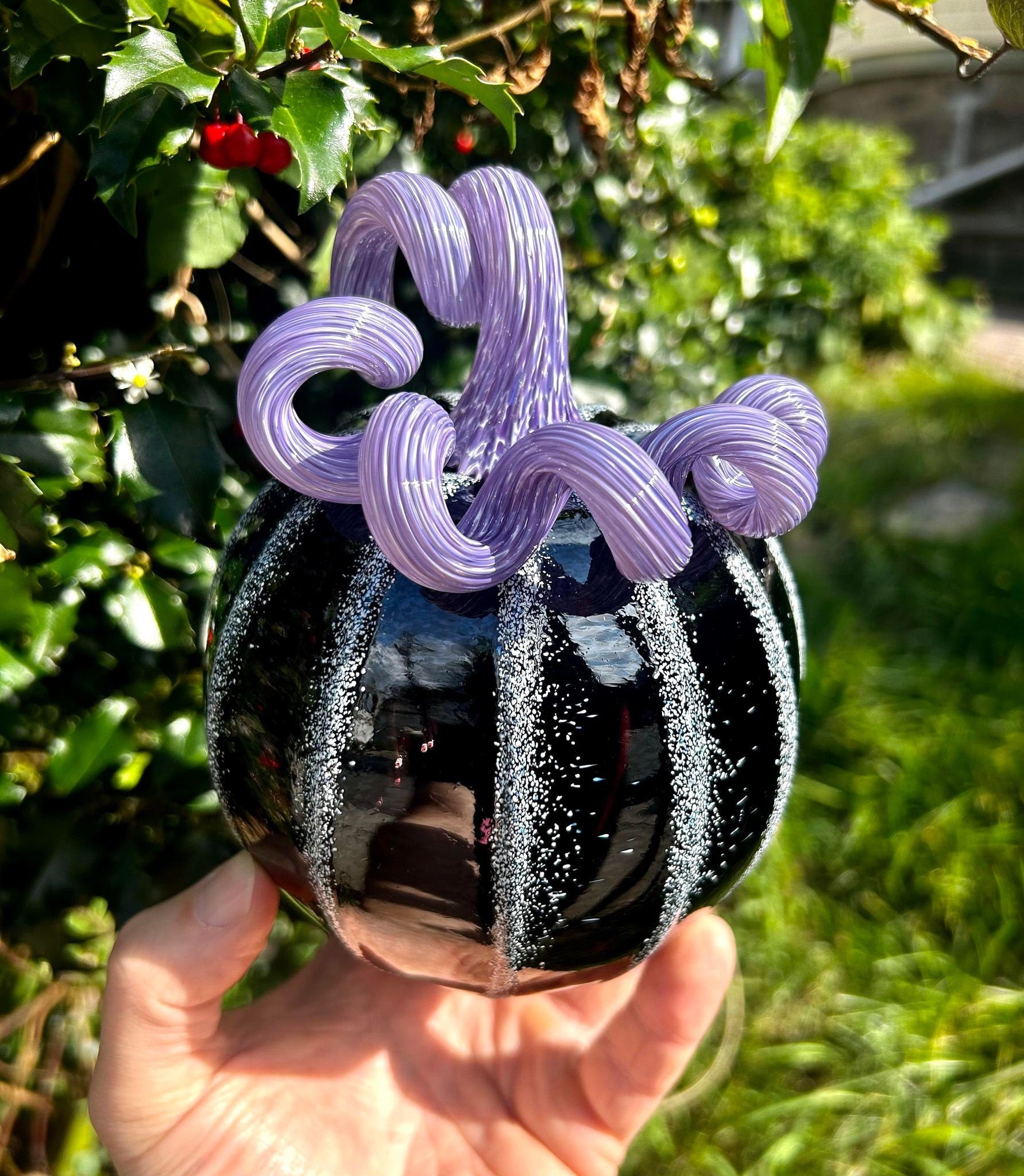 This listing is for a Purple Licorice Halloween Decor Glass Pumpkin with a curly violet stem.